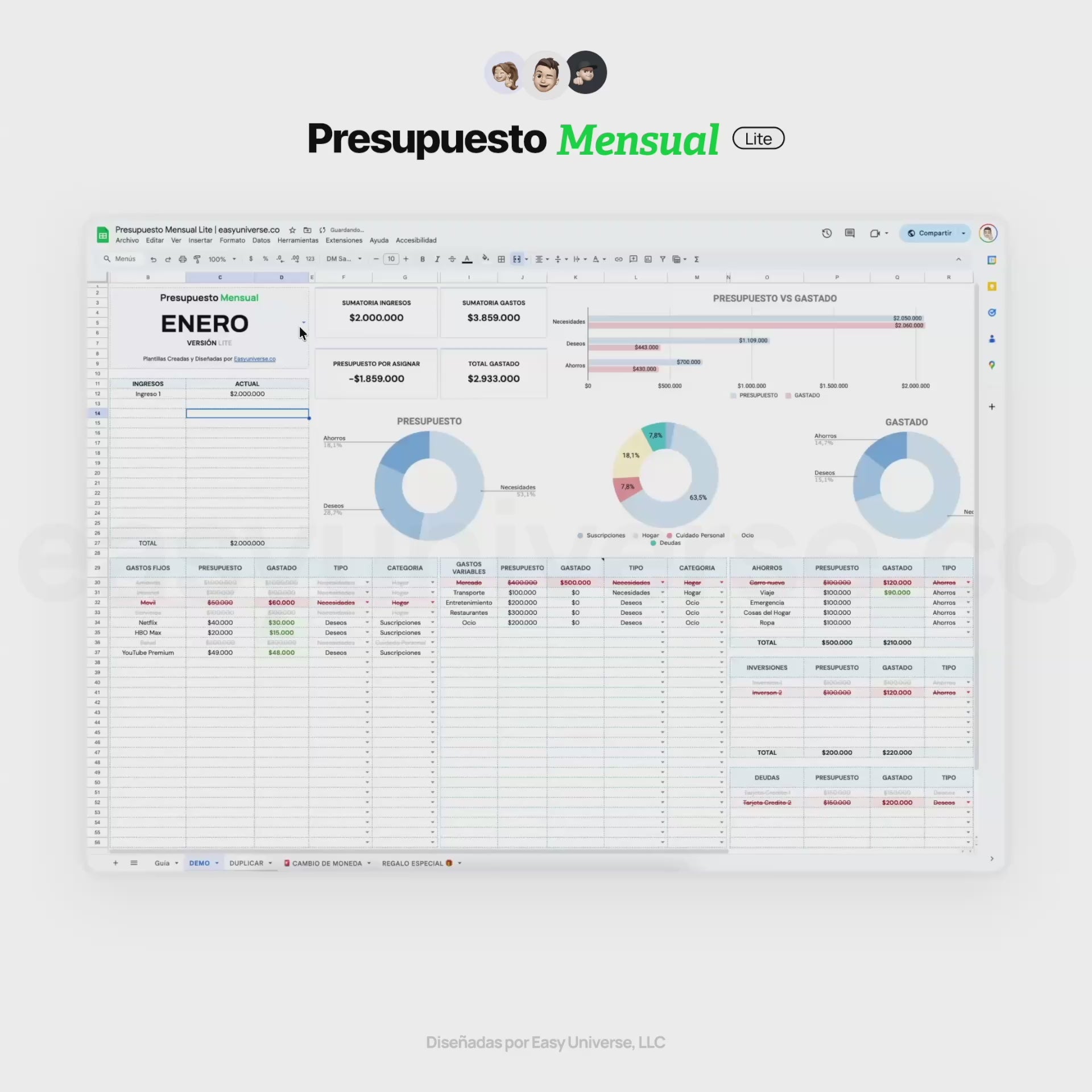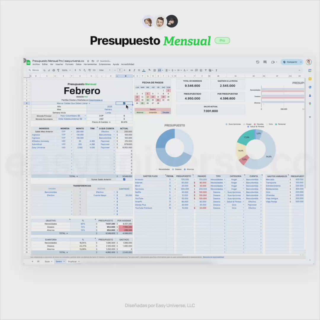 La plantilla más popular de Easy Universe diseñada para ayudarte a controlar tus finanzas sin complicaciones. Basada en la metodología 50-30-20 (50% necesidades, 30% deseos y 20% ahorros), pero con la ventaja de que puedes modificar la regla a tu medida según tus metas financieras.